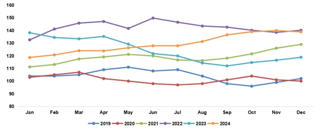 2024年全球乳制品价格指数较2023年小幅上涨,2024年平均价格指数为129.6,较2023年的124.0增长4.5%,月度价格指数在下半年高于2023年同期。价格指数上涨的主要原因是黄油价格的大幅上涨。