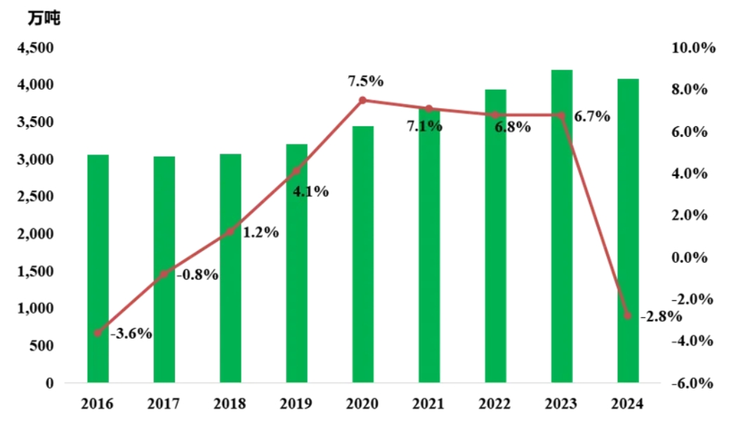 牛奶产量:中国牛奶产量自2018年起连续四年增长,2023年达4,197万吨,同比增长6.7%。2024年产量同比下降2.8%,降至4,079万吨,为2018年以来首次负增长,标志着中国牛奶产量增长进入新的调整阶段。