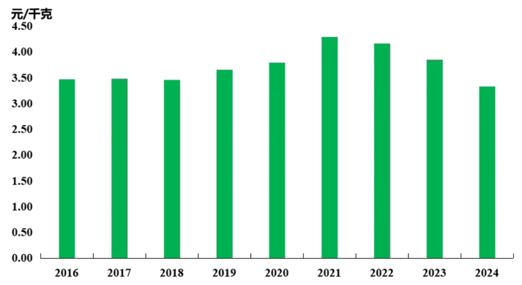 牛奶价格:自2022年起,国内奶源出现阶段性过剩,生鲜乳价格持续下行,截至2024年12月,已连续24个月环比下降,并创下2013年以来的新低点。2024年,中国生鲜乳(原料奶)均价持续走低,年平均价格为3.33元/千克,较2023年减少0.52元/千克,同比下降13.43%。
