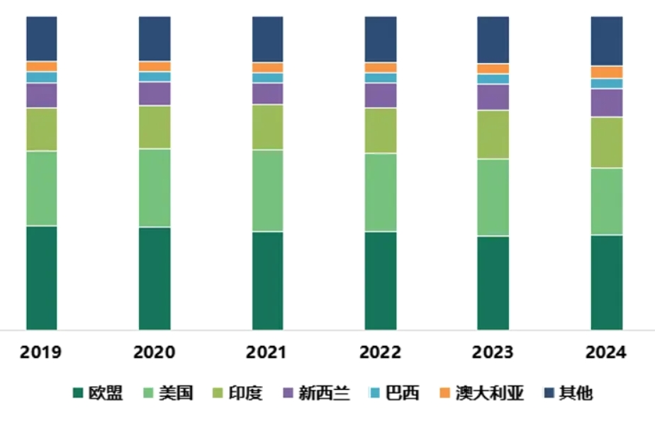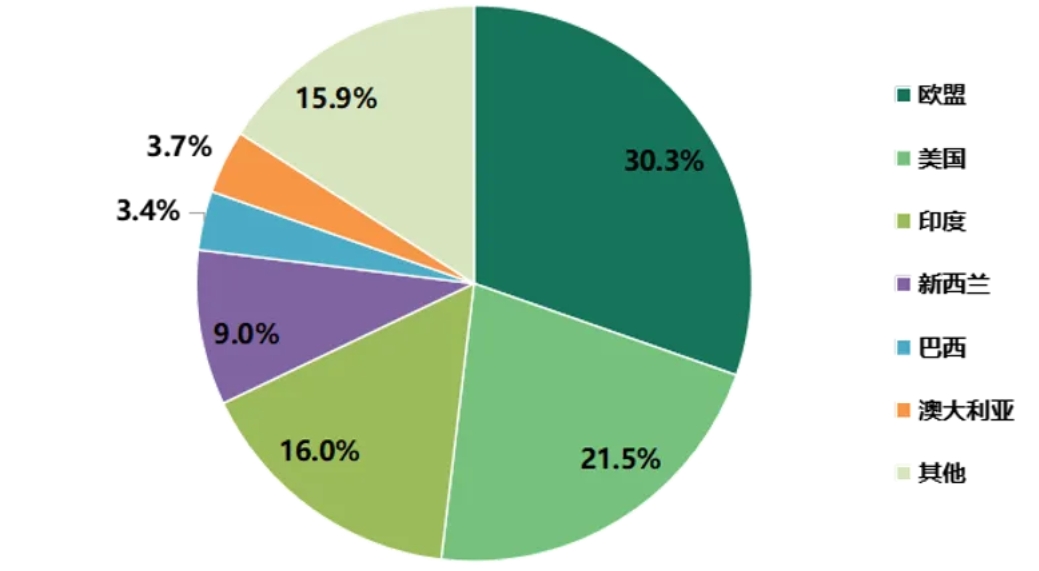 2024年,全球脱脂奶粉总产量471万吨,较2023年减少37万吨,降幅0.8%,TOP5国家占全球总量的80%。其中,欧盟产量143万吨,同比减少0.4%;美国产量102万吨,同比减少13.0%;印度产量76万吨,同比增长3.4%;新西兰产量43万吨,同比增长9.0;巴西产量16万吨,与2023年基本持平;澳大利亚产量18万吨,同比增长20.7%。