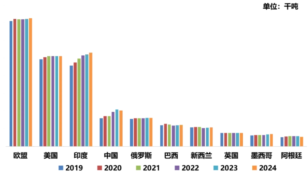 2024年,全球牛奶总产量为7.13亿吨,同比增长0.8%,TOP5国家占全球总量的60%。其中,欧盟1.46亿吨,同比增长0.73%,占总产量的20.4%;印度1.06亿吨,同比增长2.00%,占总产量的14.9%;美国1.02亿吨,同比减少0.22%,占总产量的14.4%;中国4079万吨,同比减少2.8%,占总产量的5.8%;俄罗斯3407万吨,同比增长0.8,占总产量的4.8%;新西兰2153万吨,同比增长1.3%,占总产量的3.0%。