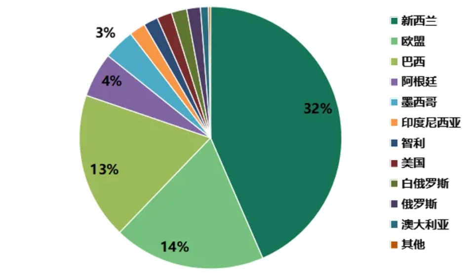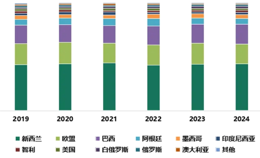 2024年,全球全脂奶粉总产量451万吨,同比增长1.4%。其中,新西兰、欧盟、巴西为全脂奶粉TOP3生产国,占全球总量的60%。2024年新西兰产量142万吨,同比增长1.4%,占全球的32%;欧盟产量61万吨,同比减少4.7%,占全球的14%;巴西产量59万吨,同比增长4.2%,占全球的13%;阿根廷产量18万吨,同比减少5.3%,占全球的4%;澳大利亚产量3.2万吨,同比增长6.7%,占全球的1%。