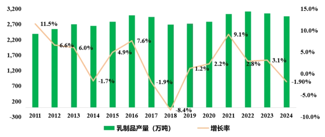 根据国家统计局数据, 2024年中国规模以上乳品企业乳制品产量为2,962万吨,同比下降1.9%。主要是中国市场供需失衡、消费疲软、成本压力、行业调整以及国际市场竞争共同作用,导致2024年中国乳制品产量下降。