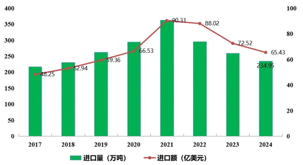 2024年中国乳制品进口延续降势,全年进口乳品(不含婴幼儿奶粉、蛋白类)235.0万吨,同比下降9.7%;进口额65.4亿美元,同比下降9.9%。