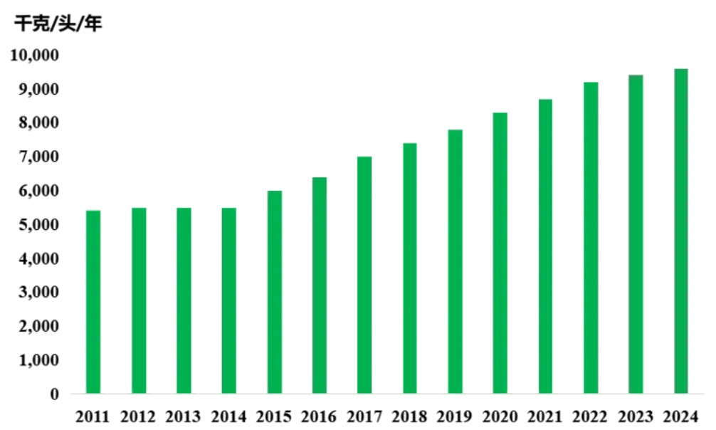 受低产奶牛淘汰、奶牛养殖技术及牛场管理水平提升等因素影响,奶牛单产稳步提高,2023年达9,400千克/头/年,2024年单产达到9,600千克/头/年,涨幅2%左右。