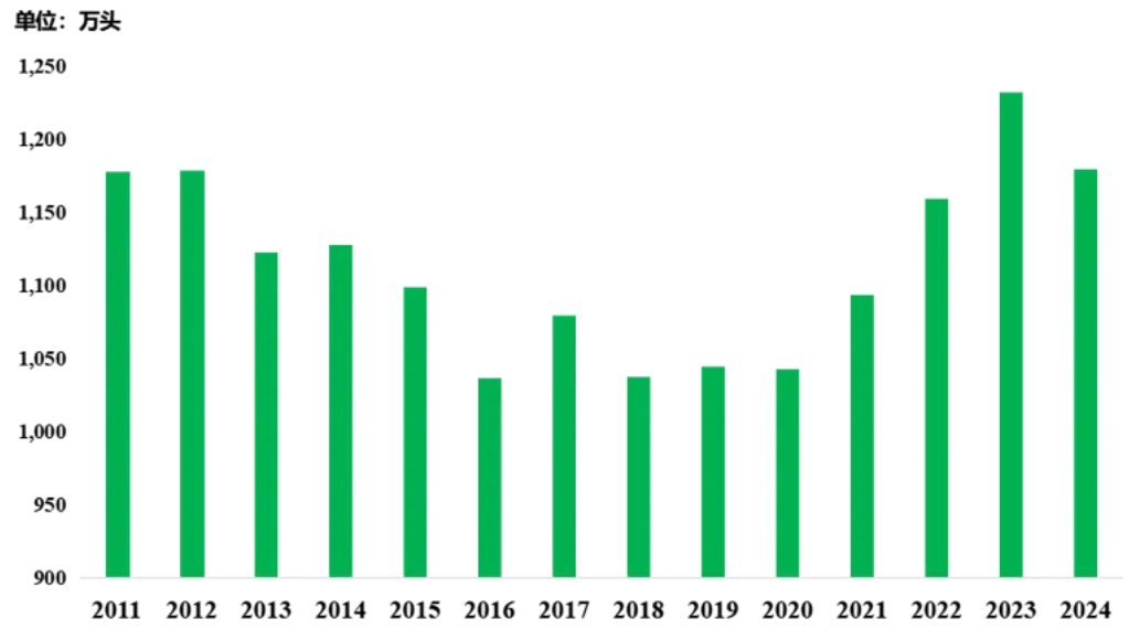 2011-2018年,受环保整治、奶牛养殖效益差等因素影响,中国奶牛存栏呈下降趋势。2018年下半年起奶价走高,奶牛养殖效益向好,奶牛存栏持续回升,2023年中国奶牛存量为1233万头,比2018年增加约200万头,2024年由于奶价持续下跌,养殖亏损面扩大,部分牧场淘汰低产奶牛,奶牛存栏下降4%左右。
