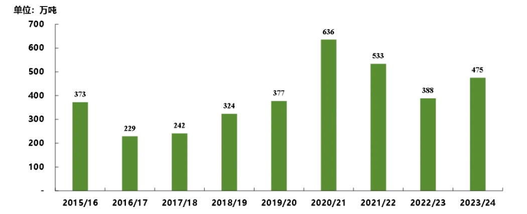 图,2015/16—2023/24榨季中国食糖进口量变化