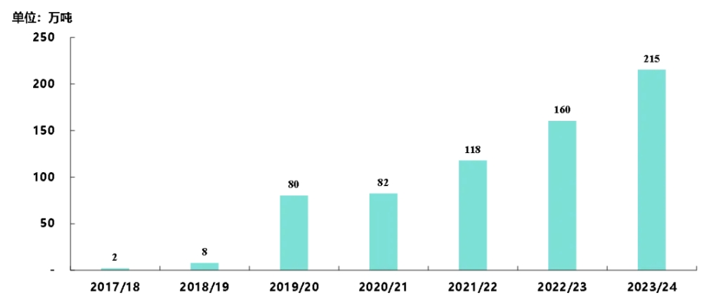 图,2017/18-2023/24中国糖浆和预混粉进口量变化