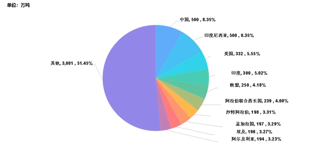 图,2023/24榨季全球国家(地区)食糖进口量及占比