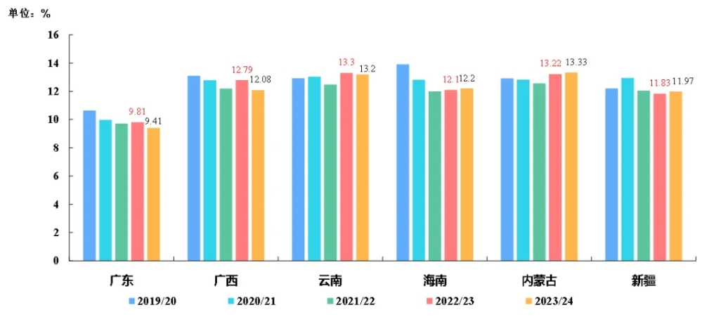 图,2019/20—2023/24榨季中国主要食糖产区出糖率变化