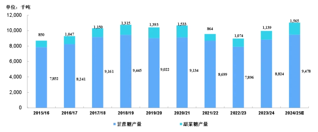 图,2015/16-2024/25榨季中国食糖产量